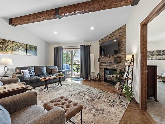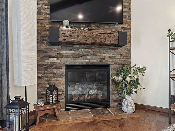 Welcome to this stunning 3-bedroom, 3-bath condo that combines comfort, character, and space. Step outside to enjoy the large greenspace and expansive rear patio—perfect for relaxing or entertaining guests. Inside, you'll be greeted by vaulted ceilings, engineered hardwood floors and a striking wood beam that frames a natural wood fireplace mantel, adding warmth and charm to the living area. The eat-in kitchen features custom countertops and backsplash, blending style and functionality for everyday living or hosting. Downstairs, the finished basement offers an open-concept layout with a large custom bar complete with a refrigerator and range, ideal for entertaining. Plus, there’s plenty of storage to keep everything organized. Bonus, it is also wired for use of generator power. This home checks all the boxes for style, space, and comfort—don’t miss the chance to make it yours!