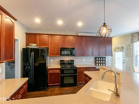 • Kitchen Features: Breakfast Bar, Cabinets Stain, Pantry, View to Family Room, Kitchen Island, Solid Surface Counters