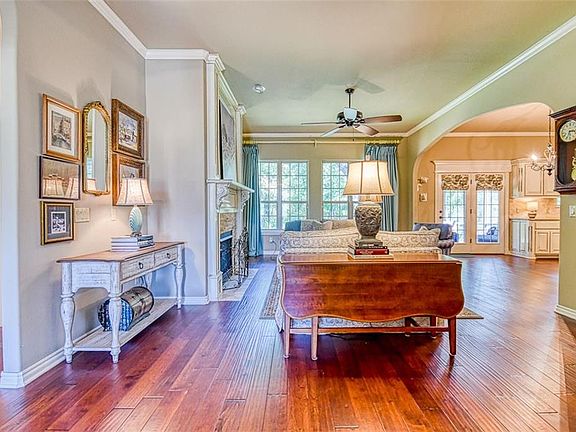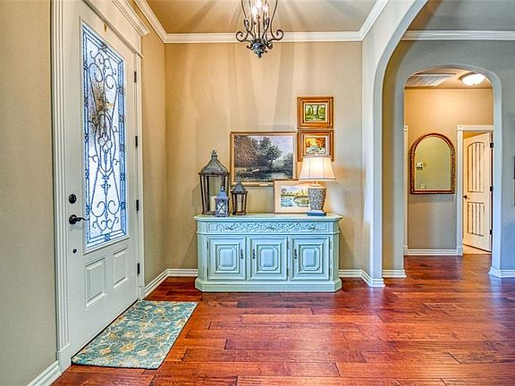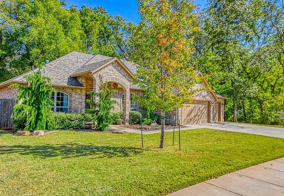 Come lounge in your little piece of Heaven. Exceptional big lot. Fantastic back yard. You will feel like in a peaceful sanctuary. Unique location backs up to greens and mature trees. Sometimes you'll hear a little creek. Deer will visit you. In the summer you will see the "Fairy Lights" (fireflies). Enclosed screened covered back patio to enjoy it all. This home is exceptional. Spacious living and impeccably maintained! Starting with the tall glass and wrought iron front door. Then enter in to a very open and light split bedroom floor plan. All flat, no steps. Formal dining can be a gorgeous study. Huge kitchen, with extensive granite counter space and endless storage. Plus a huge pantry. Storm shelter in the 3 car garage. And... a stocked pond right across the street. All these and yet so close in town. You must come see and feel this exceptional and delightful home. Close to OU, easy access to Tinker AFB and I-35 for quick and easy commute to Oklahoma City.