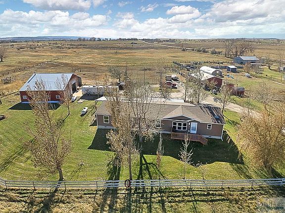 Welcome home to this 10.3 acre irrigated horse property that has everything you are looking for and more! Manufacturered house on a permanent foundation. Relax in the large open kitchen with large island, 2 living rooms, large master with a spa feel bathroom suite and soaker tub! Master bedroom has additional room can be used as office or nursery. There are 3 additional bedrooms and 2 bath on opposite side of the home affords privacy! Updates include new flooring, roof, siding, gutters, and trex deck. The property comes with 10 ditch shares BBWA. There is a 64x40 shop fully insulated, finished, electrical service and heated and an additional area set up for an office or business. The barn is set up with a tack room, inside and outside stalls. Additional storage with a shed & a chicken coop. Plenty of room to have animals. This is a wonderful property on a quiet road, 15 minutes from Billings.