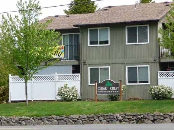 Cedar Crest Apartments. Manager on site.Pleasant surroundingsAll electric. Includes water, sewer, and garbage service. Decks. Upper floor apartment. Two laundry facilities.Month to month. Lease considered. Pet policy: Cats only with extra rent.Screening fee: $40 Applications on site or @vrmanagement.net