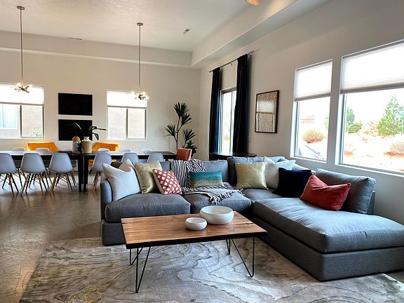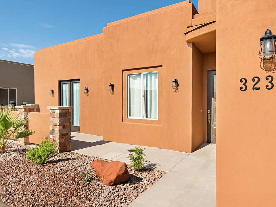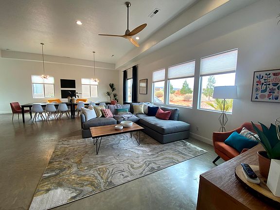 This home is in the Retreat at Sand Hollow Resort community. It features a spacious, open concept, family room, kitchen, and dining room. The white shaker cabinets, quartz counter tops, large pantry, and bar seating makes this kitchen perfect for entertaining large groups. The large master en-suite has a large vanity with two sinks, separate tub and shower, and walk-in closet.