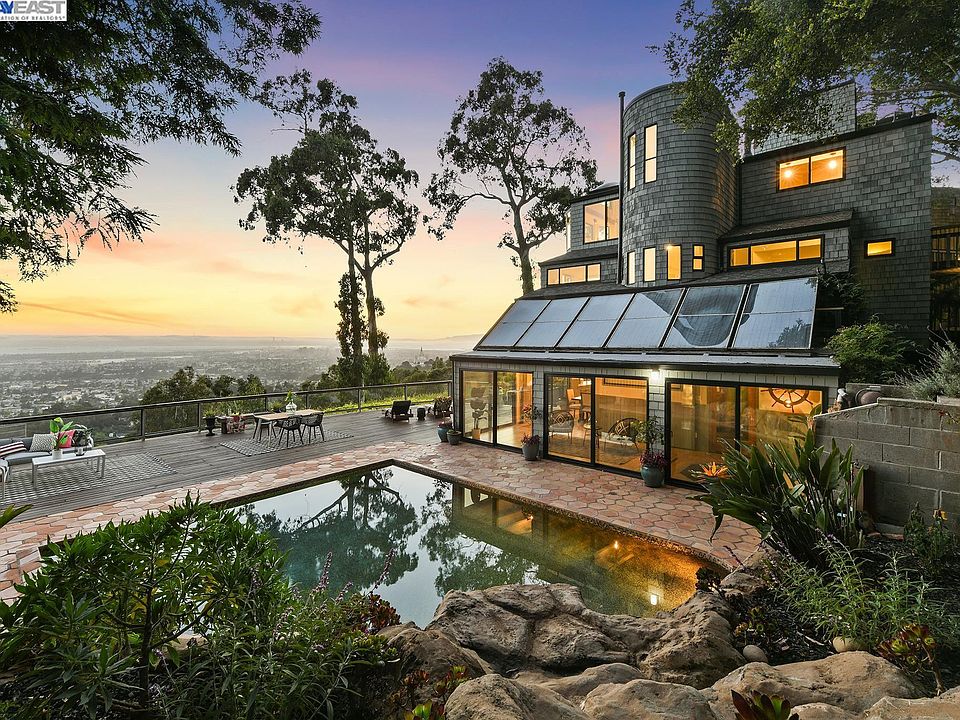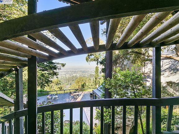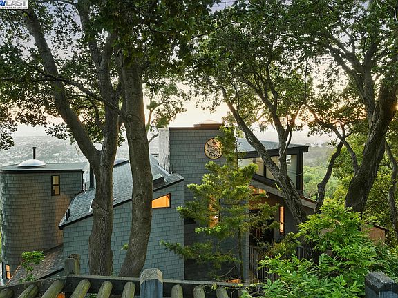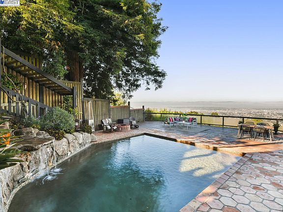 This unicorn 5BD/4BA Oakland Hills compound generates awe the minute you enter its gates and take in this vast double lot with 5-bridge views, 6000 sq ft of decking, bridges, exotic landscaping, treehouse, and gorgeous in-ground pool & waterfall. As you enter, a wall of windows offers an immersive view of the bay and SF, enhanced by the timber construction that gives the feeling of living among the trees. With 4588 sq ft, a trove of treasures includes a trapdoor wine cellar, rooftop widow’s walk, playroom, elevator, built-in ladders, and laundry chute. The primary suite features a walk-in closet, renovated split bath, dual sinks, shower, and standing soaking tub with bay views. Other levels offer a sun-washed bedroom wing with family room, baths, bonus rooms, and au pair suite with full bath and private entrance. A spacious kitchen contains 2 chef’s islands, breakfast bar and extra sink, pantry, and wood burning stove. The elegant formal dining room contains an Artcraft chandelier, and pocket door leading to the indoor jacuzzi & sauna, and doors to the decks. A spacious 2-car garage has additional storage, and dedicated off-street parking for multiple vehicles, or easy delivery access. Close to Joaquin Miller Park, Woodminster/Montclair shops, and highways. Must see the 3D tour!