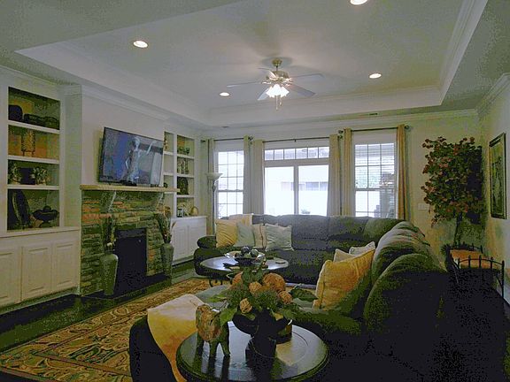 Beautiful well maintained home on cul-de-sac. Open floor plan with kitchen, dining room and great room. Great room has gas log fireplace with built in shelving and cabinets. All appliances remain including the tvs mounted over the fireplace and in the bedroom and washer and dryer. Covered back porch overlooks the white viny fenced back yard with gates on both sides of the property. Professionally installed gutters with clog resistant covers. Kitchen has spacious work areas including an island and a walk in pantry. The laundry areas has a separate storage closet. Large front porch offers room for your favorite furniture and shade in the evening.