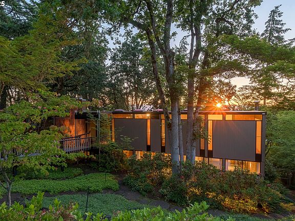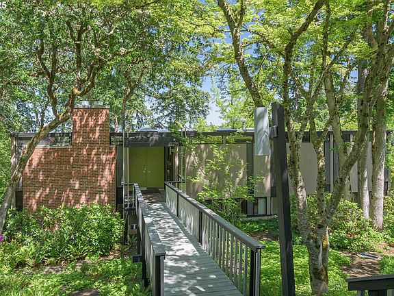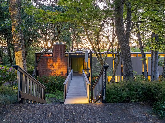 A rare find for mid-century modern purists and dreamers alike, this architectural original offers sweeping views of the Willamette Valley, with the University of Oregon and Autzen Stadium in clear sight. Boasting signature MCM lines and styling, floor-to-ceiling glass, warm hardwoods and bold indoor-outdoor flow, the home reflects the expressive spirit of the era. Over three decades, a passionate and artistic owner curated the property with theatrical flair—illuminating it with custom lighting, layered textures, and garden paths that wind through terraced grounds to a playful, bubbling fountain. This design-forward classic invites a new generation to restore and re-imagine. While some updating may be in order, the bones are strong and the character undeniable. Generous square footage, decks on multiple levels, dual fireplaces and contemplative garden seating areas & pathways offer a foundation for something truly special. MCM homes are rarely available so seize the opportunity to complete the story of this soulful Eugene original.