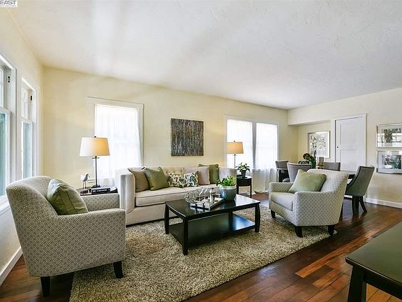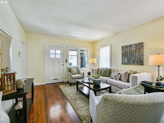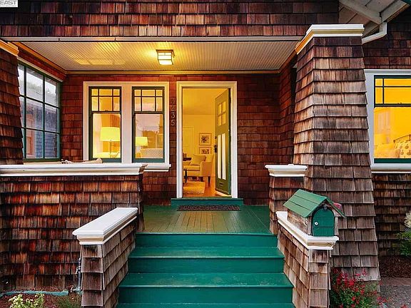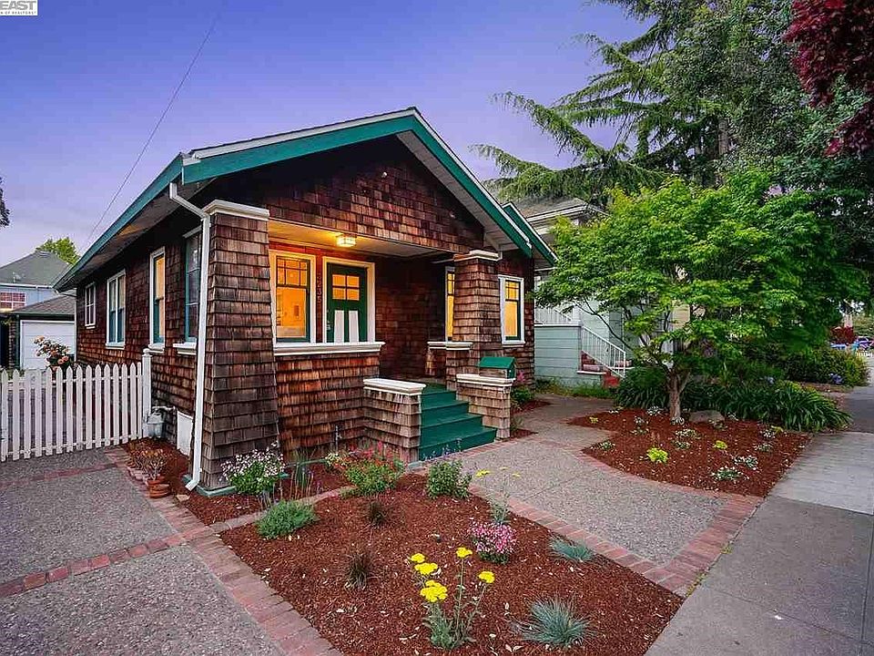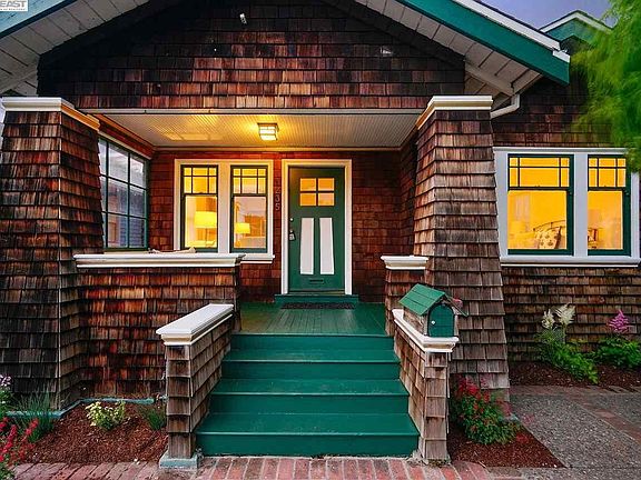 Super charming bungalow in the coveted East End neighborhood of Alameda. Built in 1915, this classic shingled Craftsman home boasts lovely architectural details, including a gracious front porch and original fir floors, recently refinished to a satiny luster. Multi-paned windows flood the living room and adjacent formal dining area with soft natural light. The front bedroom is shaded by a mature maple tree, and the rear bedroom opens to an original sun roomâ"a great bonus space for a home office or extra lounge area. The spacious kitchen boasts gleaming oak flooring, a gas range, abundant storage and a center island with bar seating and pendant lighting. Sliding doors open to a deck overlooking the sunny back yard, with mature citrus trees and a butterfly gardenâ"a sweet spot for summer barbecues. Large detached garage with laundry, shop space and even more storage. Tankless water heater and new roof. Great East End location near top schools, transportation and neighborhood shopping.