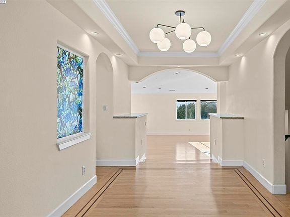 This Redwood Heights contemporary view home is waiting for your personal touches. The property offers sweeping San Francisco Bay views from nearly every room as well as the terraced backyard. 4 generous bedrooms & 3.5 bathrooms plus a flexible layout and good separations of space. The primary suite is a highlight, featuring a private balcony, an en-suite bathroom with a garden tub, and multiple closets. The open living and dining room has a tiled gas fireplace and dramatic views. A media room with an attached view patio offers an ideal hang out zone. Release your inner chef in this well-appointed, eat-in kitchen with a walk-in pantry. The backyard features a spacious entertaining deck with a built-in barbecue, wet bar, pergola covered firepit—ideal for outdoor dining and gatherings. A play structure is located on the lower deck above a secluded sauna. The deep 2-car garage offers ample space for vehicles and storage. An additional storage structure is in front plus a bonus storage room under the house. Dual zone forced air, A/C, solar, and Tesla PPA provide for budget friendly comfort. The neighborhood is near Montclair Village, Lincoln Square Shopping Center, The Laurel, transportation, and offers both privacy and convenience.