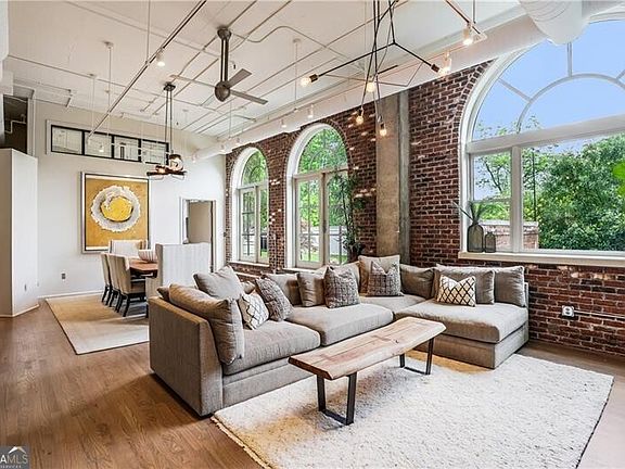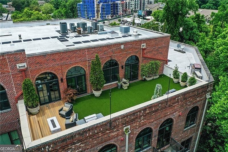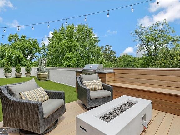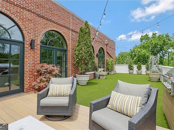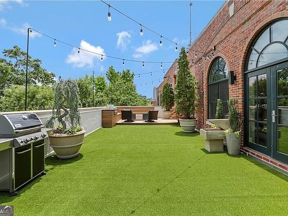 This stunning two-bedroom penthouse at Buckhead Village Lofts offers breathtaking views from its expansive turfed terrace, complete with a built-in fire pit that overlooks Atlanta's lush treetop canopy. Inside, the penthouse features soaring ceilings with exposed ductwork, light oak hardwood floors throughout, exposed brick, and a spacious, light-filled living dining area. The gourmet kitchen boasts beautiful grey cabinets, a Viking gas range, a distressed herringbone-patterned backsplash, and an island with a quartz waterfall edge breakfast bar. Multiple casement windows and doors open to the terrace, topped with arched transoms, flooding the living and dining areas with natural light and offering seamless indoor outdoor living. Modern light fixtures blend seamlessly with the exposed open systems lining the ceiling. The owner's suite has terrace access, two walk-in closets with built-ins, and a stylish bathroom with a skylight, a quartz-topped double vanity, and a seamless glass shower with geometric floor tile, and a bench. The en suite guest bedroom features a walk in closet, a spacious hall bathroom, and access to the spacious study with a built-in desk and cabinetry. This penthouse includes a storage room, two parking spaces next to the resident entrance and concierge in the gated garage, and fantastic amenities including a pool and dog park. In an unbeatable location just minutes from some of Buckheads best shops and restaurants, Chastain Park, Bobby Jones, and more! Copyright Georgia MLS. All rights reserved. Information is deemed reliable but not guaranteed.