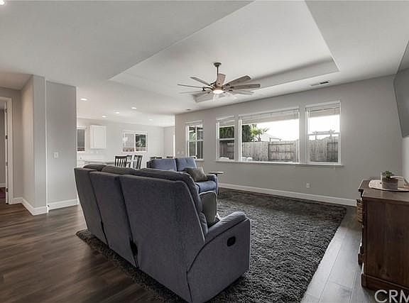 Fantastic Location for this 2017 built home with new upgrades. 2021 Owned Solar with 21 panels!! New premium wrought iron oak vinyl planking throughout! New 5" white baseboards throughout! Seller had Kitchen, bathrooms and laundry room cabinets painted white! This home offers a 3 car garage. Nice wide entry with built ins leading to the open floor plan living room, kitchen and dining area. 9 ft. ceilings throughout with a extra coffered ceiling in the living room and master bedroom. Seller has also replaced all the kitchen appliances! This kitchen offers an oversized island, recessed lighting, white quartz counter tops and a pantry. The master bedroom offers a privacy door to the covered back patio and master bath offers white quartz counters, step in shower with glass walls, walk in closet and private toilet room. The guest bathroom offers two sink vanity, quartz counters, tiled floor and a tub/shower combination. The fourth guest bedroom is off the living room and the third bathroom is right next to the bedroom, perfect for guests. The backyard is fully landscaped with new grass, extra patio area, ledger stone retaining wall, a great 9'X22' covered patio and concrete sidewalks running down both sides of the home. Wonderful backyard privacy from neighbors on this side of Sespe Creek. Call your favorite agent to schedule a showing!!!