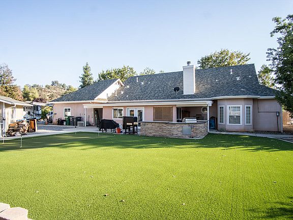 Springville Beauty on 1 Acre! Under mature shade trees with an inviting green lawn, is this farm-style country home with a wrap around porch. There are 3 bedrooms, 3 baths and 2165 sq. ft. of well designed living space. The great room has an entire wall of built-in shelving and a gas fireplace. It opens onto an enclosed sunroom that provides a great additional space for an office, home schooling set-up or play room. The kitchen is bright and white and opens onto a private shaded side courtyard. There is a breakfast nook and a reverse osmosis system at the kitchen sink. The laundry room connects to a 3rd bathroom with a shower that opens up to the back yard. The master suite has a large closet, jetted tub and a separate shower. There are 2 additional bedrooms, one with high vaulted ceilings, both on the front of the house. There is a whole-house fan and an OWNED SOLAR SYSTEM! There is an 18X48 shop which is handy for any kind of hobby and even has a 1/2 bath of it's own. The backyard lawn is synthetic, and has a 4 hole putting green in it. There is a gorgeous outdoor BBQ Island, a pergola and a fire pit. There is a 30 amp RV outlet and covered rain gutters.