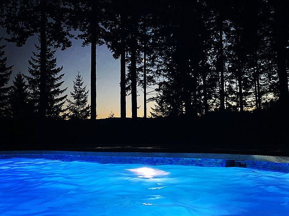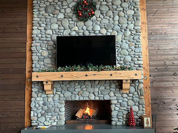 This all cedar home is stunning with a river rock fireplace and a stunning pool and hot tub