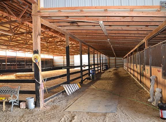 Great for horse lovers! Indoor riding arena, 20 stalls, living area in 22,000 sq ft bldg. Stalls have automatic water, sliding gates, rubber mats, lights, power in each stall with wash-down stall. Add 5400 sq ft barn for storage, 6 fenced pastures.
