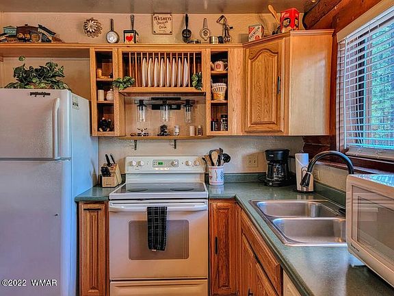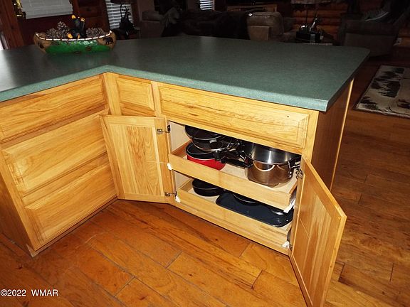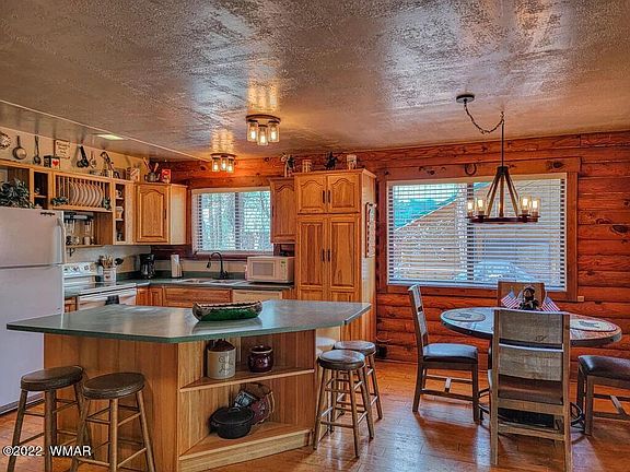 Real log cabin tucked in the tall pines. Enjoy covered front deck and balcony off master upstairs. Loft area with office setup that overlooks living area. Hardwood flooring in living room and kitchen, cabinets with pull-out drawers, fully fence for fur babies, fully furnished, includes membership to Pinetop Lakes Recreation Center.