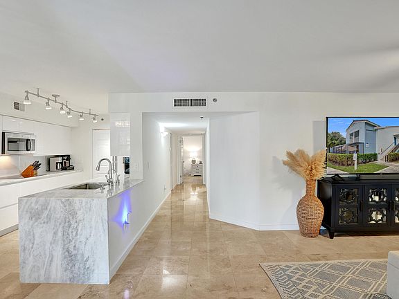 Completely renovated 1st floor corner unit with full impact glass windows and doors in gated community with pool/tennis/pickleball. Can lease right away. No expense spared in this beautiful condo w/ marble floors leading into a stunning modern kitchen with sleek custom high-end cabinetry, quartzite countertops with a waterfall edge, and stainless steel appliances. Bathrooms are tastefully updated with matching quartzite countertops and dual sinks in the primary suite. A bonus space off the living room is currently used as an office. Additional highlights include a covered patio off both the primary bedroom and living room, spacious bedrooms, walk-in custom closets, full-size in-unit laundry, and a newer AC. Can be rented immediately! ideal for both end users and investors. Community info: The community was recently renovated with freshly painted exteriors and offers resort-style amenities: pool & spa, clubhouse, business center, gym, EV charging, tennis & pickleball courts, indoor racquetball, billiards, BBQ area, tiki bar, playground, and more. A 24-hour manned gate ensures peace of mind in one of Boca Raton's most sought-after locations. Top-rated schools, walking distance to shops and dining, and just a short drive to the beach!
