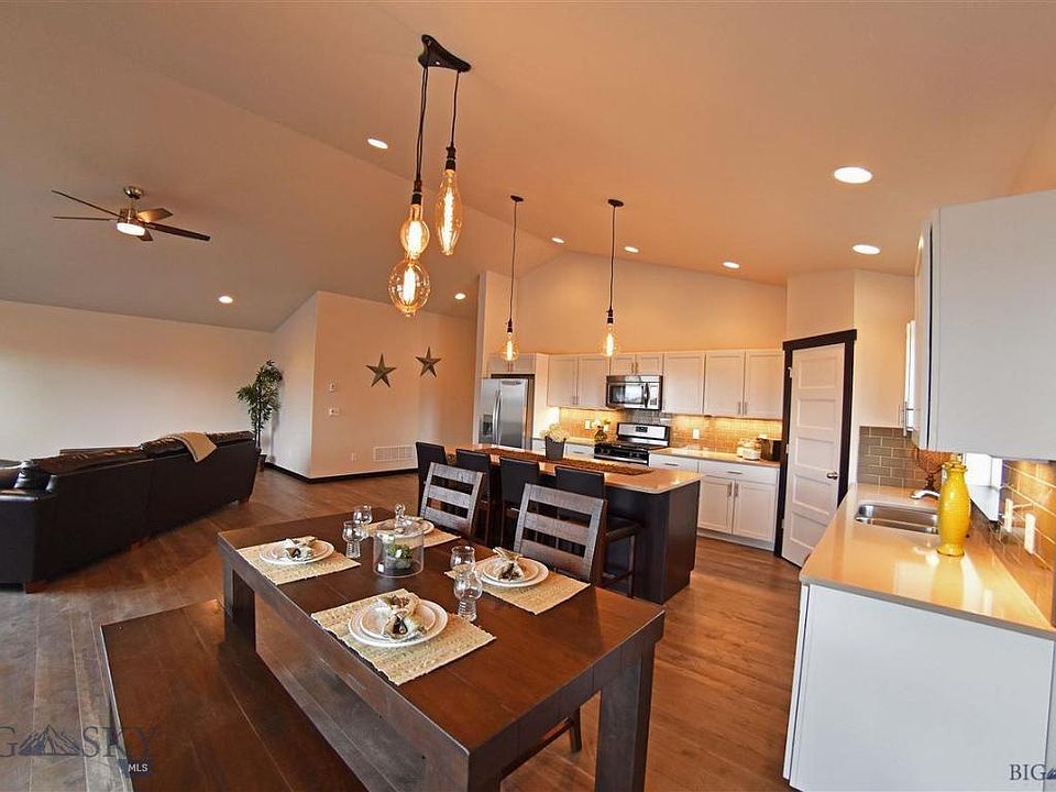 Beautiful highly sought after Southside Bozeman Home. Located in Meadow Creek Sub, location here couldn't be better. Close to MSU, Hospital, shopping. Expansive Westward sunset view you wont get enough of! Welcome yourself home to this Brand New Kirchhoff Construction Beauty. 3 beds, 2 baths, plus extra storage office. Vaulted ceilings in every room! Quartz & Custom Granite slab counter, softclose/dovetailed cabinetry, under cab lights, GORGEOUS kitchen, beautiful walk in dual head master shower. MUST SEE!