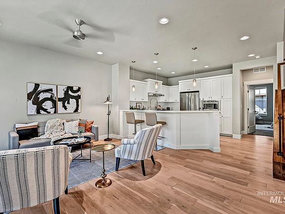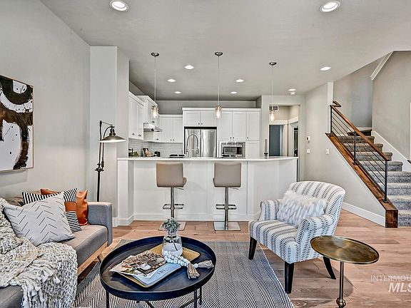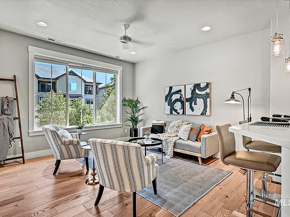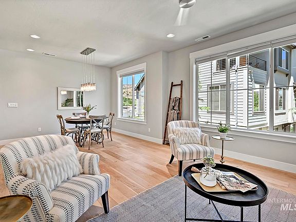 This Beautiful Townhome is located just steps away from the Boise River & Greenbelt, Marianne Williams Park and the Boise foothills. The townhome features a community pool and club house, low maintenance, easy living with views and just blocks away from Bown Crossing. The layout features a bedroom and full bath on each floor, balcony with 2 master/primary bedrooms with walk-in closets on the second and third floor with a two car garage. Home has carpet in the bedrooms, wood floors in the great room and entry, tile floors in the bathrooms, quartz countertops, gas range and custom cabinetry, comes with stainless steel appliances. HERS Certified Energy Efficient. No Rental Restrictions.