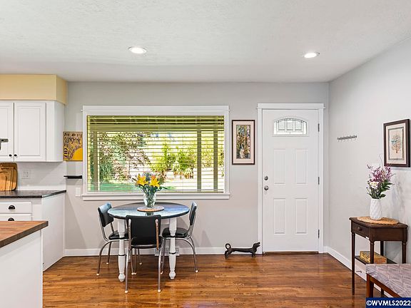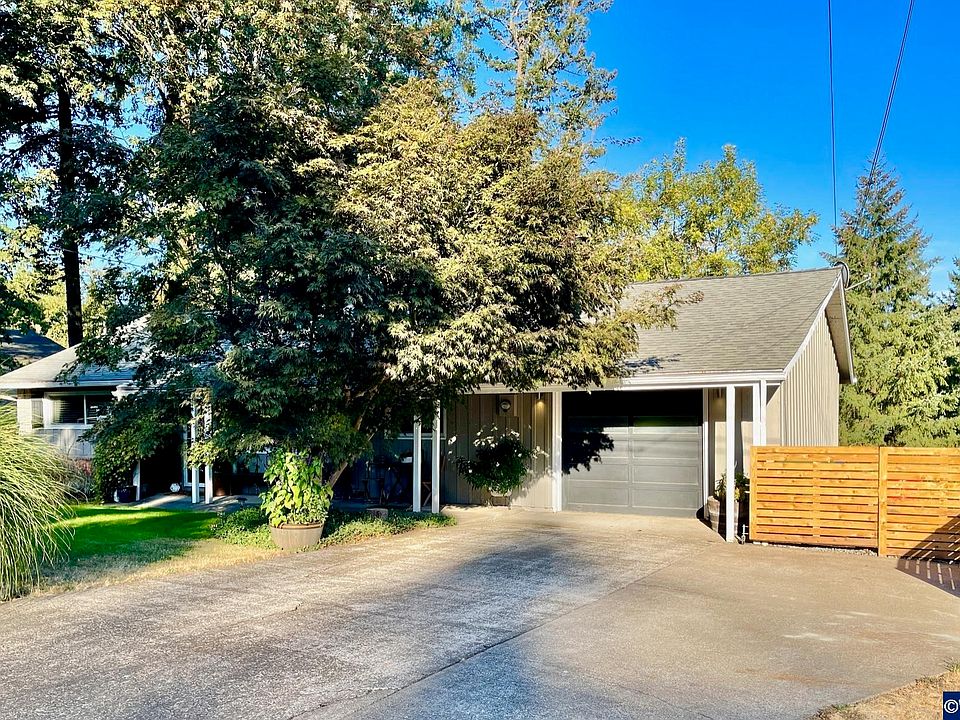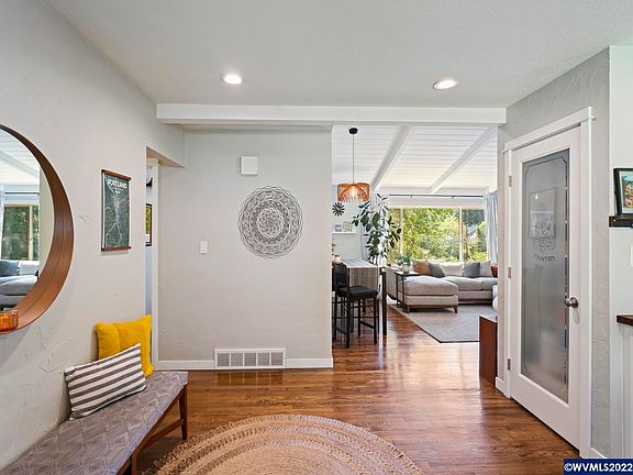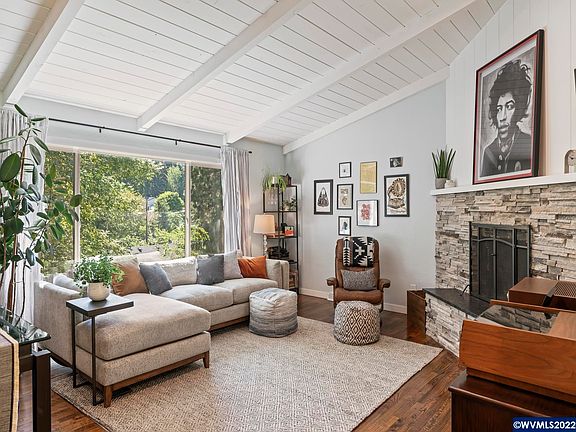 Captivating modern mid-century home w/endless updates. Open spaces w/dual living possibility. Beautiful wood floors upstairs, new LVP floors & custom-made dry bar downstairs w/huge windows. Updated kitchen w/subway tile, marbled granite counters & SS appliances. Ideal work-from-home space. Stacked rock fireplaces, newly painted interior & updated bathrooms. A/C. New cedar fences, raised garden beds, river rock firepit, park-like backyard. Friendly neighbors. Minutes from parks,restaurants, & downtown Salem.