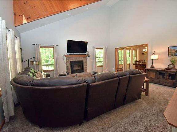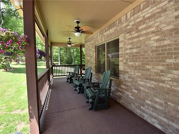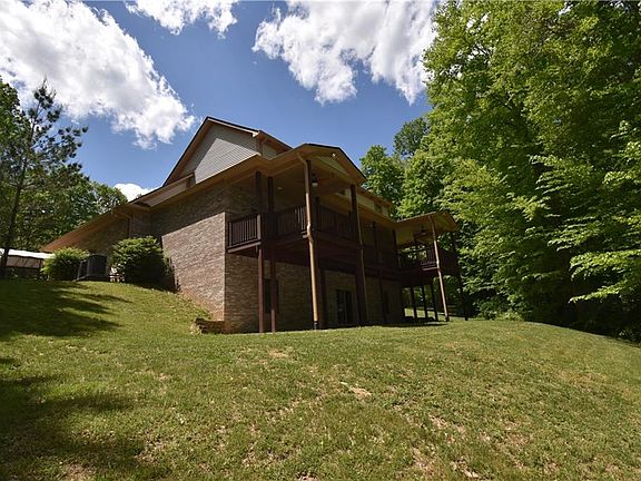 Country living at its finest! Gorgeous home sits on nearly 5 acres w/ a 40x28 pole barn & small lake w/ dock. LR has soaring ceilings w/ tongue & groove wood at the peak & brick, wood burning fireplace. Newly remodeled, eat-in kitchen comes w/ new cabinets and granite countertops. Main floor master has a walk-in closet, double sinks, garden tub, tiled shower & private balcony. Upstairs is complete w/ loft, 2 BRs, full bthrm & bonus room (700 sq. ft.). Walk-out basement w/ concrete patio out back. Updates: Radon system, leaf filter gutter system, and expanded parking by pole barn. Have movie nights in the fully equipped theater room! Enjoying nature will come naturally on the wrap around porch overlooking the wooded property.