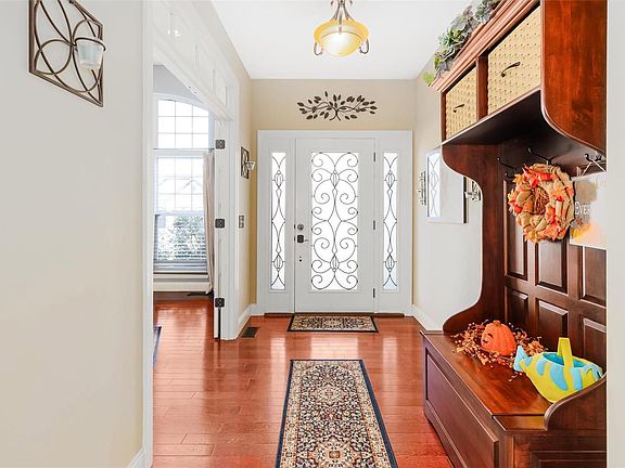 This beautifully built home offers 2,700 sq. ft. of living space, 3-car garage and private tree-lined fenced backyard. A blend of luxury and comfort. Popular open floor plan with lots of natural light, gleaming hardwood floors and high ceilings. Private office. Separate dining area accented by columns and tray ceiling. The spacious gourmet kitchen opens to the family room, with 7.1 channel surround sound, breakfast area and hearth room, with built-in cabinets, that overlooks a private patio. Two gas fireplaces. Main floor laundry room. There is a second patio, with a pergola, off of the breakfast area. On the second floor, there are 4 bedrooms and a workspace area. Spacious master bedroom, with vaulted ceiling, and luxury en-suite bathroom. Unfinished basement with rough in and egress window. Enjoy walking trails, stocked pond, playground and pavilion. Convenient to New Town shops.