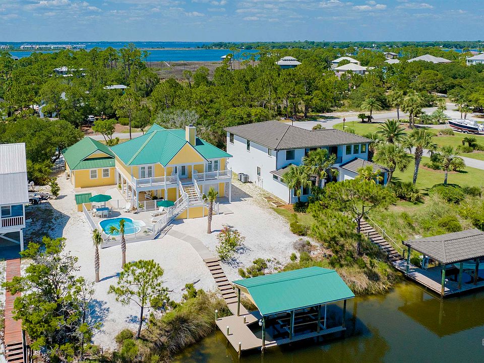 Ono Island Charmer. You will immediately fall in love with this cozy canal-front sturdily built waterfront cottage: antique hardwood and tile flooring; impact glass windows with protective metal shutters; standing seam metal roof; durable cypress siding; huge climate controlled high impact constructed garage with counters, sink and lots of storage space; technology-enabled kitchen appliances; convection air fryer oven; filtered water spout; primary bed bath with oversized shower with waterfall feature; custom closets with built-in files, cabinetry wood shelving, cedar walls; another separate garage for small boat, trailer or car with storage room for boating, fishing and pool toys; waterfront POOL with new 4' fencing/self enclosure gates, covered seating and Trex decking; covered boathouse with lift; several covered porches; an open concept floor plan that comfortably sleeps 8 adults. First level bedroom can also be used as an office and/or additional living area. This is a home that will make you happy the moment you step inside.Ono Island is a unique sanctuary on the Gulf Coast with special custom homes and property owners who have lived and traveled worldwide. Home ownership is highly sought after and the homeowner association maintains natural environment standards for the island's canals, surrounding waterways, native landscape, bird habitat and island community amenities for residents to enjoy. Buyer to verify all information during due diligence.