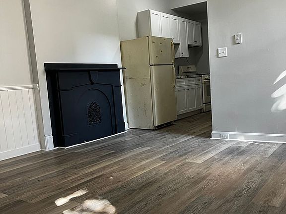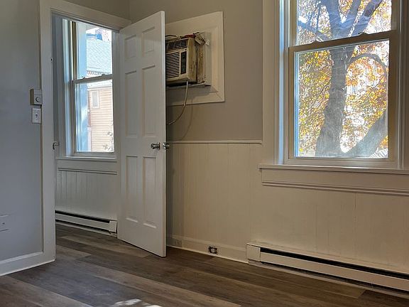 1 BR apartment, first floor newly renovated. New kitchen cabinets, replacement windows, paint and flooring. New stainless steel refrigerator not shown in kitchen. Includes one off street parking space. Just three blocks from downtown.