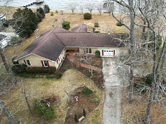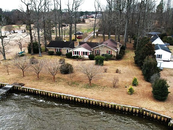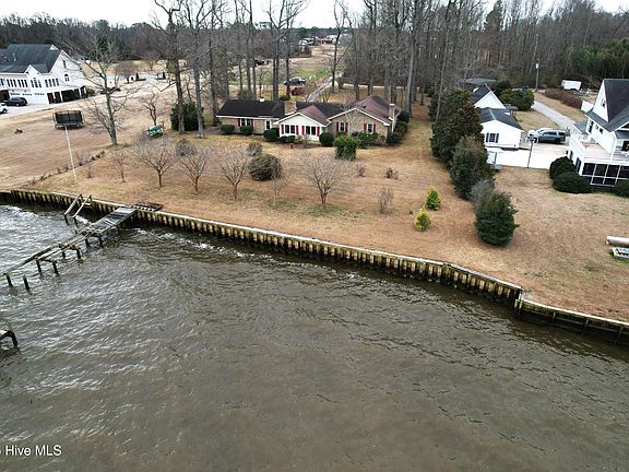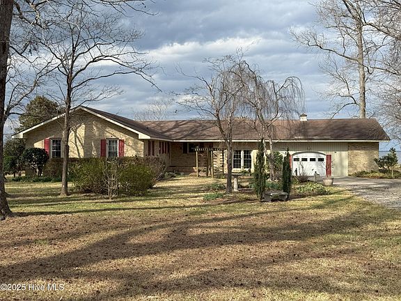 On the market just in time for Spring or Summertime enjoyment! Enjoy privacy, tranquility, and spectacular waterfront living with this beautifully situated property overlooking the Albemarle Sound! Enjoy the spectacular sunrises and sunsets it has to offer as a perfect backdrop for peaceful year-round living or a weekend escape. With ample outdoor space to host summer gatherings, with mature landscaping and direct water access, this property offers it all! Sitting on 1.12 +/- acres with 163 ft of bulkheaded waterfront, this L-shaped brick ranch is in great condition and ready for it's new owner. The home offers 3 bedrooms and 2 full baths, with an open Living Room and Dining Room. The kitchen features abundant cabinet space, center island and breakfast nook area, with large opening into an enclosed sun room with panoramic views of the water! What a great room to sit and enjoy your morning coffee, evening meal or just to sit and relax! The Living Room and drop-down Den both offer wood burning fireplaces. The single car garage includes 2 additional rooms. The utility room with washer and dryer hook-up and additional full bath, along with a tool room for extra storage. These owners added the PVC vinyl bulkhead, a 65' pier, 16'x20' deck with pergola and pilings for a boat lift.. Repairs needed to pier. Great location near public boat ramp located less than a mile from the home in Mackeys Marina, along with great food at the local restaurant, The Landing at Mackeys. The private road is a deeded right-of-way for purposes of ingress and egress to the property. No HOA. Don't wait to schedule your showing and make this waterfront property your own!