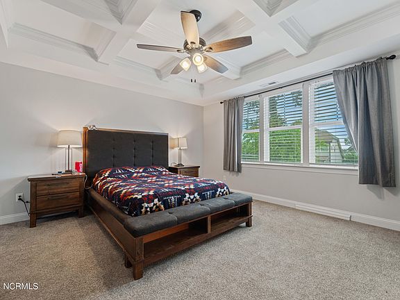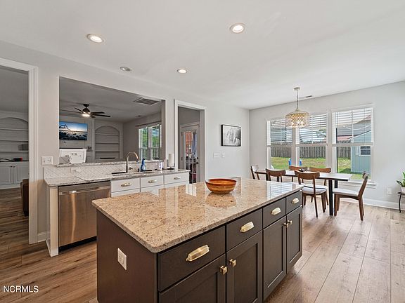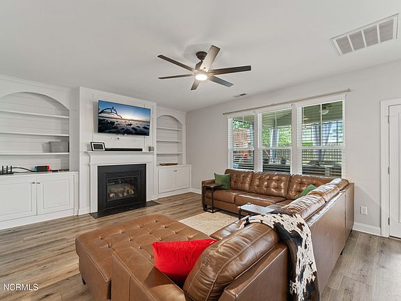 Stunning 4 bedroom 2.5 bath home with open floor plan, huge kitchen, and finished third floor! This home is located in sought after Neighborhoods of Holly Ridge. Pulling up to the home you will notice the covered front porch with a chandelier hanging to greet all your guests. Stepping inside the home you'll see the LVP floors extending through the home and the custom wainscoting down the foyer. The french doors to the left open up to the inviting family room with a coffered ceiling tons of natural light. Stepping further into the home you come to the living room that is open to the kitchen. The large living room has built-ins around the fireplace with shiplap back walls in them. Excited about seeing the kitchen you walk into the kitchen and notice the huge island in the center that is perfect for the holiday meals with gorgeous granite countertops, tile backsplash, and ton's of cabinets. There is even a pantry in the corner. All of the appliances stay except the refrigerator which will be replaced with the refrigerator in the garage. You stand in the kitchen in awe and see the large dining room right off the kitchen imagining how your dining table will fit perfect there. But there is a lot more house to see so you move up the stairs (which also have LVP flooring) to the 2nd floor. The master suite is waiting at the top of the stairs to the left with a coffered ceiling and plenty of room for the king set waiting for you to have delivered. The master bath room features his and her sinks, a walk-in shower and even a soaking tub. At the back of the master bath is a huge walk-in closet with plenty of room for his stuff too. There are 3 other large bedrooms on the 2nd floor, one of which even has a built in sitting area with cubby's perfect for collecting thoughts and making memories. There is a guest bath and the laundry room is also on the second floor. This home even has a third floor that has carpet, lighting and a ceiling fan but no HVAC. This adds approx. another 500sf to the home that is perfect to let the kids go play in or great for storage. Moving back downstairs and walking out back, you step in to the screened in porch with a bar top that stays, great to sit and sip your favorite beverage while the kids run in the back yard. The back yard has an extended patio area with a canopy that stays and a fire pit. There is a shed in the back yard and even a play set for the kids to run and play while you enjoy that beverage. The back yard is completely fenced in and there is even a planter box that stays for you to start a garden. This home is minutes from the beach, shopping and a short commute to Camp LeJeune's back gate, home to MARSOC. Schedule your private tour today!