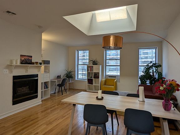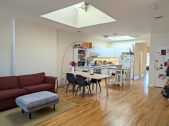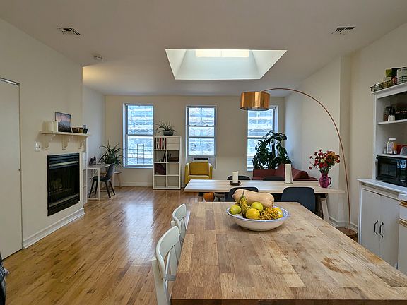 Extra Large, sunny floor through 2 bedrooms in Boerum Hill on the top floor of a walk up. 2 blocks away from Atlantic Ave Barclays Center with 9 subway lines. Covering approx 1000 Sqft, walk into the spacious living room with an open kitchen. The living room measures 24'X17', faces the front of the building and has a great layout to set up all your furniture pieces. Enough room for you to set up your home office area as well. The living room also has a working gas fireplace for you to enjoy during the colder days. A formal dining table can easily fit right next to the kitchen area. The open kitchen has plenty of cabinets and counter space and comes with a dishwasher and gas stove. Features Two Large Skylights- One in the living room and one in kitchen. With North and South exposures and plenty of windows throughout the apartment, this apartment gets consistent light throughout the day. (six windows total) Plenty of closets for storage throughout (4 closets in total). The rear-facing bedrooms provide you with plenty of peace and quiet and its south-facing windows let in plenty of light. Both rooms can easily fit Queen size beds and plus additional furniture. Bedroom 1 is approximately 15' x 9' Bedroom 2 is approximately 17' x 7'6' Wide hallway provides room for additional storage pieces if needed. Hardwood floors throughout and tiled bathroom with a large tub. The coin operated washer and dryer are located in the basement. A large private locked bin is also included for additional storage needs. Cats and dogs welcome- upon approval Tenants pay for all utilities Located 2 blocks from the Atlantic Ave Barclays Center subways 2,3,4,5,B,Q,N,R,and D lines, the LIRR and Barclays Center. Lots of cafes and restaurants all around the vicinity.