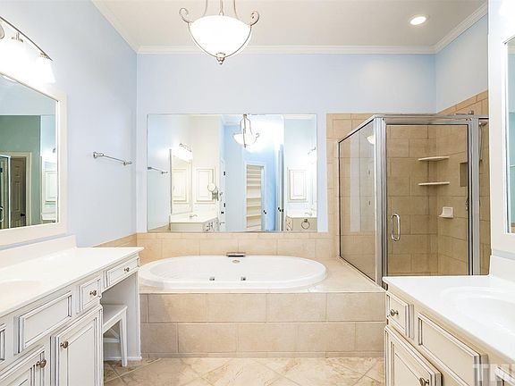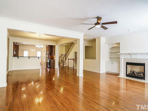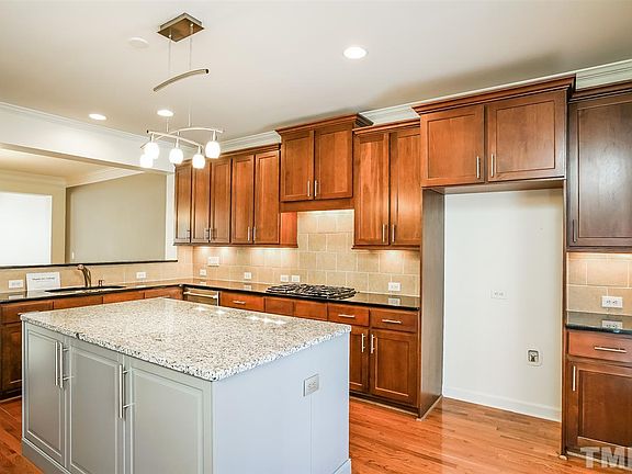 This Cary two-story townhouse offers granite kitchen countertops with island, a master suite with dual vanities, a gas fireplace, and a covered deck.
