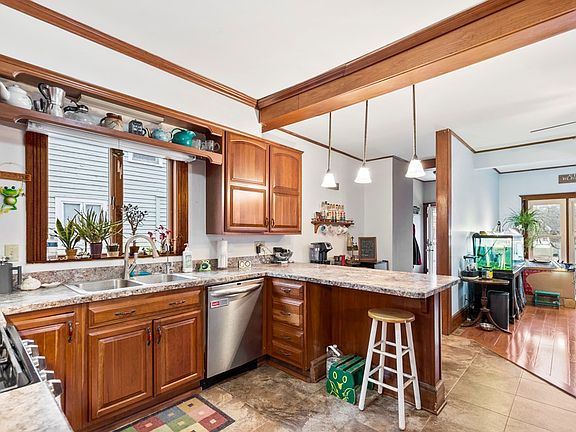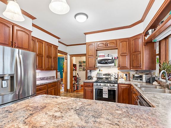 Discover this spacious 5-bedroom, 3 bathroom Victorian gem, featuring a primary suite with an attached full bathroom. Gorgeous hardwood floors and woodwork add timeless elegance throughout the home. Enjoy the updated kitchen and bathrooms, designed for modern living while maintaining the home's classic charm. Relax on the covered front porch or entertain guests on the large rear deck overlooking a generously sized in-town lot. Additional features include tank-less hot water for ultimate convenience, first floor bedroom & full bathroom, energy efficient vinyl replacement windows, and a 2-car detached garage. Don't miss the chance to own this captivating blend of historic charm and contemporary comfort!