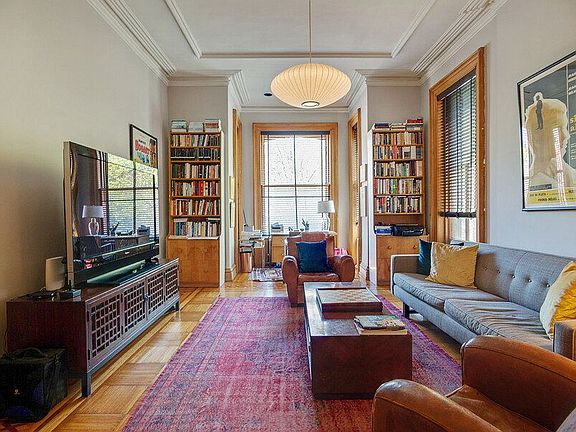 Located on a picturesque street with shades of grand old trees surrounding landmarked brownstones and historic homes, this enormous 2 bedroom plus study/office floor through apartment in splendid mansion is available for rent. As you enter the mansion you see a grand entry hall with impressive center staircase and then walk up 1 flight to this grand and massive floor through apartment with 12 foot ceiling. With approx. 1600 square feet, this apartment offers 2 bedrooms, formal living-room and dinning room, a large open kitchen , 1 large windowed bath, great closet space, inlaid flooring, tall windows, stained glass, built-in book shelves, etc and a private deck looking into an amazing landscaped garden. Lots of amenities near by: Only Minutes to variety of restaurants, bars, cafes, subways lines (C and G trains), Fort Greene Park with its Saturday farmer market and tennis court. And short stroll to the atlantic center with several subway lines (q,d,b,4,5,3,2,r,n) LIRR, Barclay center, target, BAM
