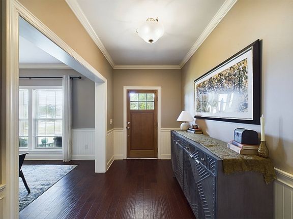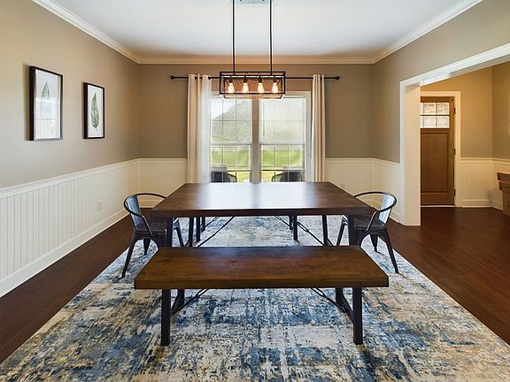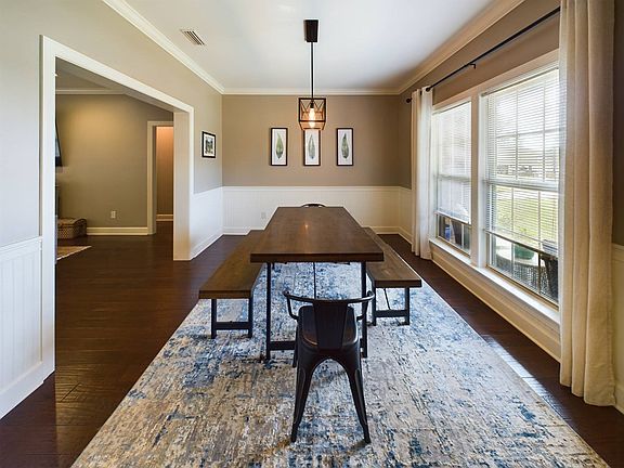This stunning 4-bedroom, 2-bathroom brick home in Hidden Lake East offers a front porch view of the serene lake, perfect for relaxing mornings or evenings. Enjoy access to a common area for fishing and a charming covered bridge, enhancing the community appeal. Wonderful 10x20 deck in your spacious privacy fenced back yard. Step inside to discover an inviting open floor plan that seamlessly connects the living spaces. The kitchen is a dream, featuring a granite-topped island, stylish subway tile backsplash, stainless steel appliances, and a pantry for all your storage needs. The foyer and formal dining area boast elegant wood floors and classic wainscoting, adding a touch of sophistication to the home. The master suite is a true retreat, complete with a luxurious bathroom featuring a lengthy granite vanity with dual sinks, a jetted tub for unwinding after a long day, and a beautifully tiled shower. With 2,340 square feet of living space, this home combines comfort, style, and functionality. Arlo security cameras to stay with home! Don't miss the chance to make it yours!