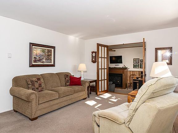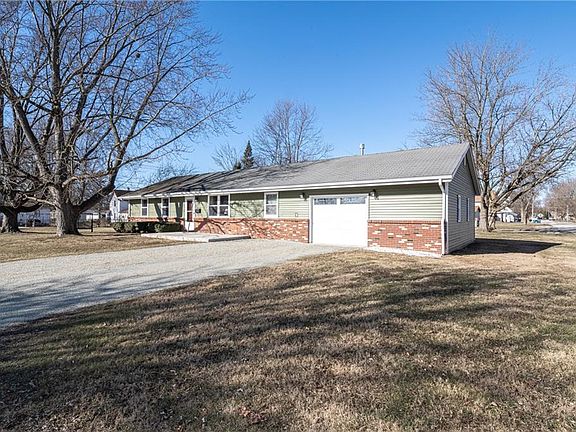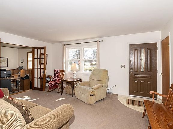 Updated 3BR Ranch walking distance to town. New siding, windows, fireplace and furnace. Living room with antique double doors opens to great room w/natural gas fireplace and dining area. A cozy gathering space. Kitchen completely renovated with new 36in soft close cabinets, large center island, subway tile backsplash, and gorgeous quartz countertops. Master bedroom with double closets. Updated bathroom. Spacious laundry w/storage area. Real wood floors under carpets. Garage is oversized w/finished workshop/office space. The perfect man cave. Large patio and lovely landscaping makes a great atmosphere for summertime cookouts.
