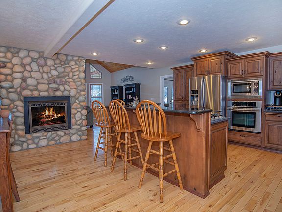 Luxurious lakefront home w/100â of premium water front. This 5 bed, 3 bath home features a full lake view! Floor to ceiling river rock gas fireplace. Wrap around composite deck w/covered area - great to take in the lake air year round! Main Floor luxury suite. Lower level family room w/game area & wet bar. 6 car heated garage & fully paved driveway w/RV parking. Gorgeous, low maintenance landscape & concrete driveway to lake w/big dock and covered boat slip. Waterfront living at its absolute best!
