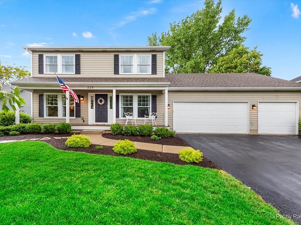 Impeccably maintained home sits on a beautifully landscaped 1/4 acre lot with a massive 5+ car heated garage! Open floor plan has spacious kitchen with white cabinets, built-in wine rack, large center island and STAINLESS STEEL APPLIANCES. Flexible space on the main level can be configured to your liking with gorgeous wood laminate, neutral paint, and a beautiful gas fireplace. Upstairs you'll find BRAND NEW CARPET throughout. The expansive master suite includes ceiling fan, vaulted ceiling, WALK-IN CLOSET with custom shelving and an attached MASTER BATH with double sinks. Two additional bedrooms include spacious custom closets, ceiling fans, and tons of room! Completing the second floor is another full bath with double sinks. The full FINISHED BASEMENT offers rec/family room, bedroom, office/playroom, full bath, fireplace, and a laundry room with newer washer and dryer. Recently stained deck overlooks beautifully landscaped yard with stone patio and fire pit to enjoy on the cool summer nights. The HEATED GARAGE is any car enthusiasts, wood workers, or hobbyists dream - so much room & even has pull down stairs leading to storage over garage. New windows and sliding glass door installed 2021. This is the one! Schedule your showing today! *This property is owned by an IL licensed real estate broker.*