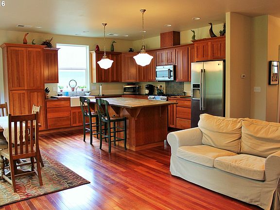 Gorgeous newer home on 2.12 park-like acres. Home is light & bright w 9ft ceilings, Brazilian Cherry wood floors, & recessed lighting. Kitchen features custom cabinets, SS appliances, & a lg island. Open living rm has a beautiful gas fireplace w custom mantel. Property includes a lg front yard, 2 fenced pastures, 12x40ft shop/barn & plenty of room for gardening. All appliances, washer/dryer included. Short walk to downtown!