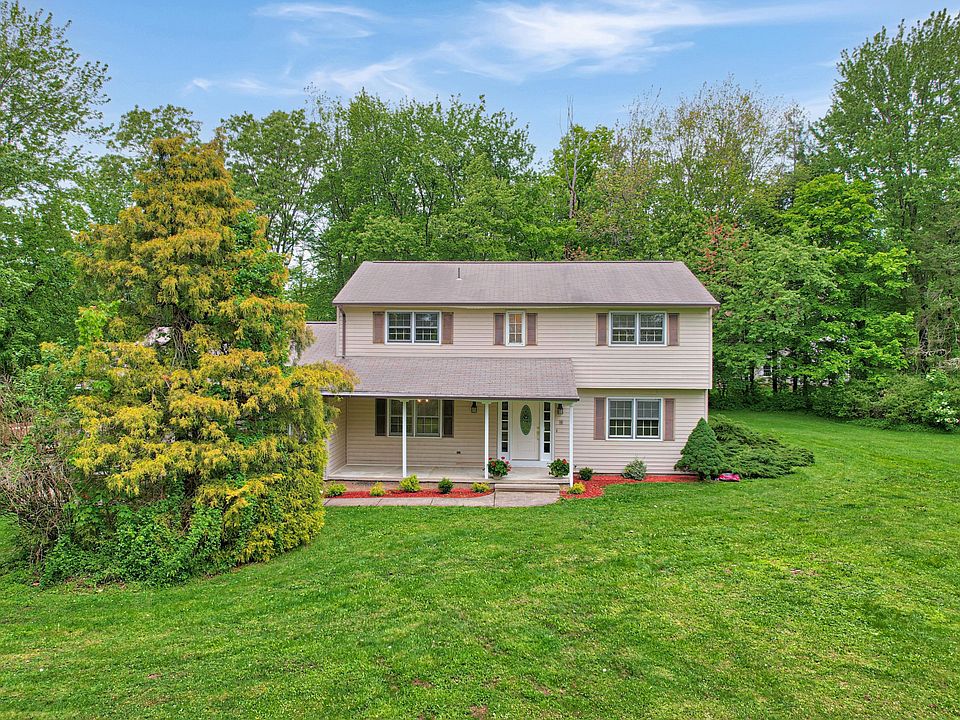 Welcome to your future home! This beautiful one-owner Colonial, built with pride and care, is nestled on a private 1.57-acre lot surrounded by lush trees. New septic system being installed 11/1/2025. Step inside and be greeted by gorgeous raised panels and over 2,200 square feet of living space. This well maintained home features 4 generous bedrooms and 2.5 remodeled bathrooms. With fresh paint throughout, all hardwood floors refinished, reglazed kitchen counters, new carpet in the family room, and new 6-panel doors, this home is truly move-in ready. The inviting eat-in kitchen offers a practical work area, space for a dinette table, a pantry, a convenient laundry area, and a half bath. The adjacent dining room, with its double entrances, flows nicely into the sunny spacious living room, boasting beautiful gleaming hardwood floors. The cozy family room, complete with new carpet, a fireplace, and sliders to the patio, is perfect for relaxing and grilling. Upstairs, you'll find four well-sized bedrooms. The master suite features two ample closets and a stunning new full bathroom. Enjoy the added comfort of central air conditioning and central vacuum. Imagine spending your summer on this picturesque, level property! Please note: This sale is contingent upon third-party approval.