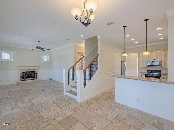 - Breakfast Bar, Crown Molding, Fireplace, High Ceilings, Paneling/Wainscoting, Recessed Lighting, Storage