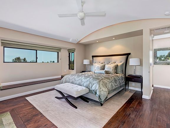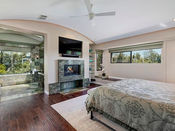 Stunning Architectural with recent renovations of superior quality materials and craftsmanship. Tucked in a secluded setting on a corner lot with privacy of high hedges. Sweeping views to the ocean are visible from almost every room and the outdoor tired-decks. A warm and inviting home featuring beautiful woods, dramatic natural stone works, fine fixtures, and appointments. There are beautiful wood floors, 3 fireplaces, 3 T.V.s, and skylights. The master suite is on the second level with an incredible bathroom, walk-in closet, and fireplace. In addition there is a lovely guest suite on this level. A junior master suite with a fireplace is on the main level. The kitchen has exquisite stone surfaces, an eating island, stainless steel appliances and outdoor entrance. From the living room, walk out to the first deck with a firepit, BBQ, and seating. The second level offers space for dining al fresco and entertaining. Lights strung overhead add to the enchanting setting. This is a superb one-of-a-kind residence!