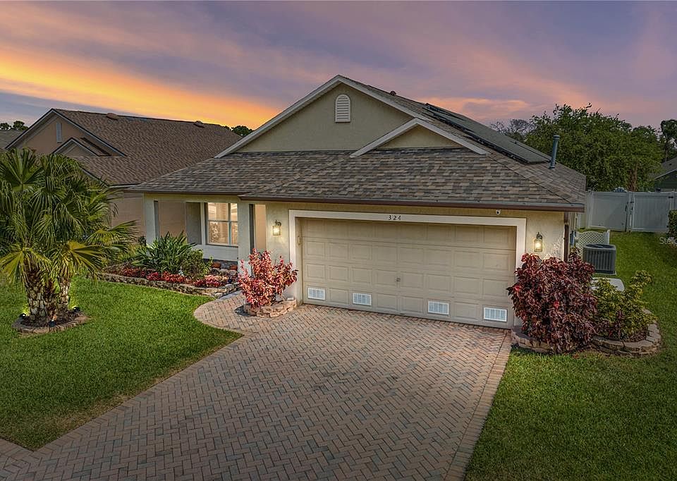 Welcome to 324 Regency St, a charming and beautifully maintained single-family home nestled in the highly sought-after gated community of Green at West Haven, located in the vibrant city of Davenport, FL. This exquisite residence boasts three spacious bedrooms, two full bathrooms, and a host of wonderful features that are sure to impress. As you enter the home, you are greeted by an inviting open floor plan that seamlessly blends the living, dining, and kitchen areas, making it perfect for entertaining guests or spending quality time with family. The kitchen is a chef's dream, featuring gorgeous countertops, stainless steel appliances, ample cabinet space, and a large breakfast bar with seating. The adjoining dining area provides ample space for hosting family dinners and intimate gatherings. The master bedroom is a true retreat, complete with a large walk-in closet with custom wood built-ins and an en-suite bathroom that features a large walk in shower, and dual vanities with granite countertops. The two additional bedrooms are also generously sized and share a full bathroom. One of the highlights of this exceptional property is the new solar panels, which provide energy-efficient living and significant savings on utility bills (No separate loan needed for these solar panels!). Other notable features of this home include a newer architectural shingle roof(2021), Generac generator powered by natural gas (always on, no refilling) that powers whole house (including AC and appliances), two-car garage, a laundry closet with a washer and dryer, and a screened-in porch overlooking the beautiful backyard. The Green at West Haven community is a true oasis, boasting a safe gated entrance, sidewalks for walking/running, tennis courts and a wonderful community pool. It is conveniently located just minutes from shopping, dining, entertainment, and some of Central Florida's top-rated attractions, making it an ideal location for both primary residences and vacation homes. Don't miss the opportunity to make this beautiful home yours. Schedule your private showing today and experience the best of Florida living!