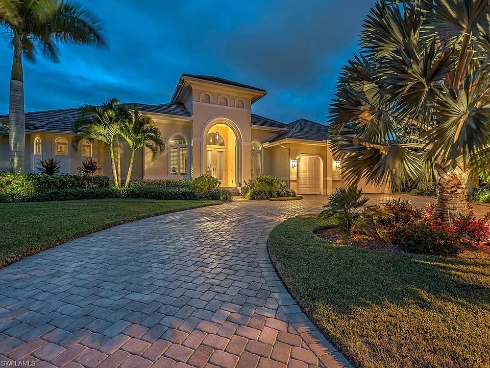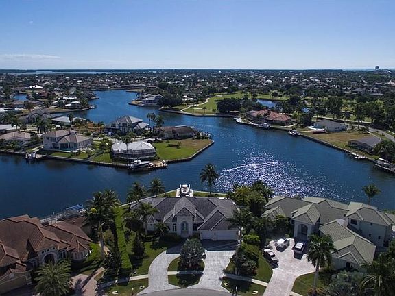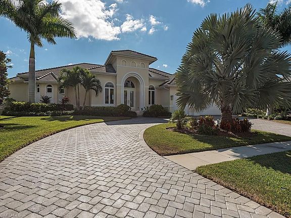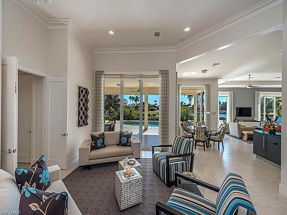 H.11320 Immaculate waterfront home has southern exposure and commanding views. The open floor plan allows plenty of room to entertain. Fabulous details throughout - large, custom kitchen, soaring ceilings and walls of glass. Master suite with luxurious bath and dual walk-in closets. Spacious lanai with pool/spa, electric screening and a full pool bath. Mature landscaping creates a private setting. Cut-in boat dock with 12K lift in a convenient boating location. Glorious sunsets with the Island Club in the distance.