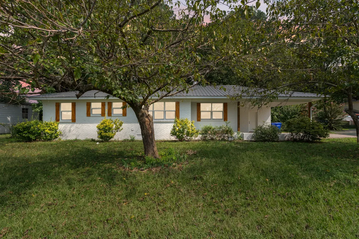 Painted white brickShady tree canopyEnsuite bathroomCustom tile showerMetal roofSpacious floor planSliding glass door