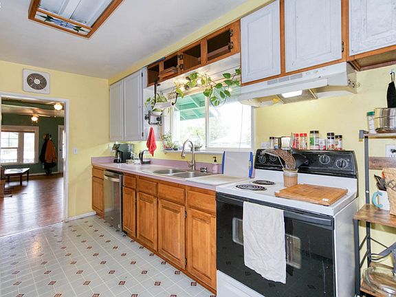 Spacious 3 bed, 2 bath home with metal roof, out of the flood plain! Huge partially finished attic (sqft not included) for plenty of storage, and a covered porch in the front. Gas stove, wood floors in living room, and a galley style kitchen with large laundry-utility room and many cupboards. Lot is over 1/4 acre, with a fenced back yard and deck. There are two trees and garden beds containing hundreds of flower bulbs. Ample parking for an RV or boat, that would still leave room for cars!
