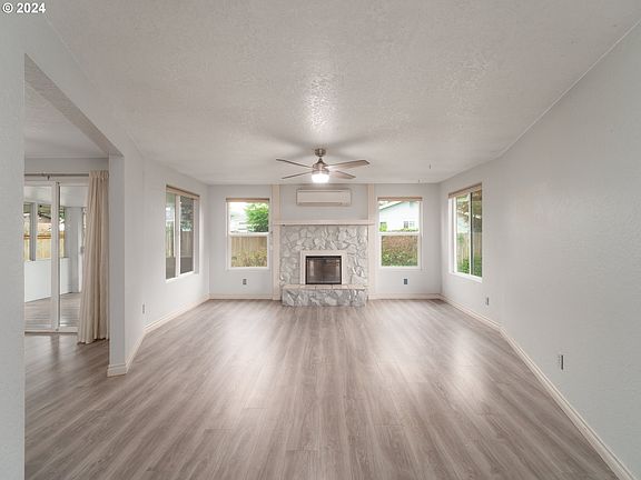 This charming home boasts a fully renovated kitchen featuring warm white KraftMaid Hayward Maple cabinets with easy-shut doors, complemented by elegant Silestone Quartz countertops in ocean storm colors. The kitchen also includes a convenient rollaway island with a built-in wine holder, stainless steel appliances including a fridge, an oversized range hood, and durable vinyl plank flooring that flows seamlessly through the kitchen, entryway, and living room, where you'll find a cozy built-in electric fireplace. Nestled in a tranquil and quiet neighborhood on the east side of Sutherlin, enjoy the convenience of upgraded ductless mini-splits in the living room and all three bedrooms, ensuring optimal climate control throughout the year. The main bathroom features a shower-tub combo, while the primary suite boasts a full bathroom with an easy step-in stand-up shower. The exterior of the home features a metal roof, freshly touched-up exterior paint, and manicured front and back yards offering great curb appeal. Relax and entertain in style with a sunroom and covered porch in the backyard, perfect for enjoying the outdoors year-round. For outdoor enthusiasts, the spacious driveway easily accommodates a camper, trailer, or other toys. You'll appreciate the two-car garage, fenced backyard, and paved walking path that offers easy access to both the front and back yards. Schedule your private tour today!