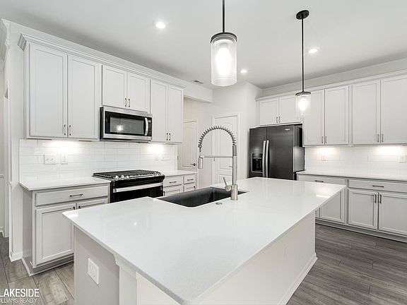 Striking fireplaceModern finishesOversized islandStylish fixturesSecond-floor laundryWarm inviting atmosphereOpen-concept home