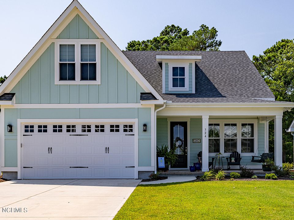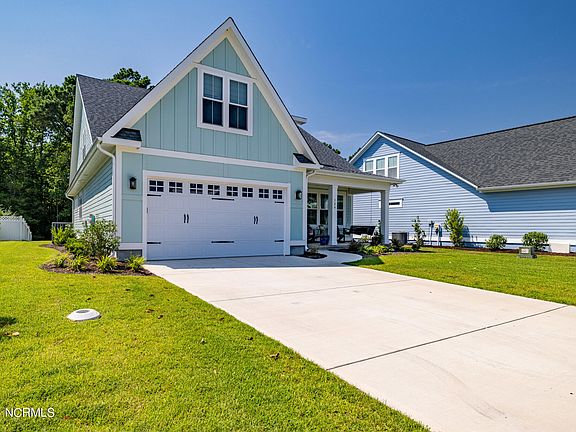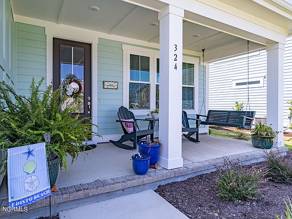 Welcome to true coastal luxury at 324 Summerhouse Drive in the prestigious community of Summerhouse on Everett Bay. This private, gated community is located just minutes from the beach and a short drive to Camp Lejeune & Wilmington. This custom home was completed in 2023 and has striking curb appeal, with its beautiful coastal colors, pristine landscaping and durable yet elegant fiber cement siding. Upon entering the home you're greeted with an elegant foyer with wainscoting and beautiful luxury vinyl plank flooring throughout. Just off the entrance you'll find an ample bedroom, perfect for a guest suite, with closet and sliding barn doors for privacy. Entering into the main living area you'll be amazed by the vaulted ceilings, built-ins flanking the stylish fireplace and expansive sliding glass doors overlooking the covered patio. The kitchen is an entertainer's dream, open to the living area with custom cabinetry with soft close drawers, a large island, granite countertops, gas stove and beautiful tile backsplash. There is even a large pantry behind a pocket door with durable built in shelving. Just off of the living area you'll find the well appointed primary suite with elegant trey ceilings and a large ensuite custom bathroom. The primary bathroom has a gorgeous tub and custom tile shower with glass surround. Through the primary bathroom you'll find the spacious primary closet with custom built in shelving. As an added bonus, the primary closet conveniently opens up into the first floor laundry/mud room! You'll also find an additional full bathroom downstairs with a beautiful tile shower. Going up the wood tread stairs, you'll find the upstairs is quite spacious and well laid out. Two large bedrooms can be found upstairs, along with an oversized bonus room and additional full bathroom with beautiful tile flooring. The home offers additional energy efficiency with hermetically sealed, foam sprayed attic space that manages sound deadening and maximum energy efficiency. It also maintains a constant temperature and managed humidity in the attic space to further protect the HVAC equipment and truss components. The Summerhouse community provides true coastal luxury. It's huge clubhouse has a billiard room, bar area, full kitchen, resort style swimming pool and fitness center. You'll also find day docks within the community, a boat ramp and boat storage. For the active lifestyle, the community has a tennis and basketball courts, 6 lakes, 9 miles of hiking/walking trails, a playground, outdoor pavilion, as well as multiple picnic areas and firepits.