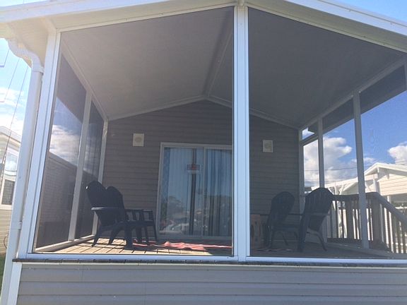 NEW! 54 x 12. It is located in a very quiet 55+ Mobile home park. Home is well built 2016 Fleetwood. It has never been lived in. Owner stayed in residence 2 nights in last year. Brand new Whirlpool appliances still have stickers on dishwasher, stove, refrigerator and Samsung washer and dryer. None have been used. Kitchen has plenty of storage space. Ungraded cabinets and flooring. Plenty of counter space. Extra lighting above sink. Table and chairs will remain. Living room is spacious and contains a couch with a double bed to allow extra sleeping. Ceiling fan with lighting gives a warm and airy comfort. Glass sliding doors open to enclosed screened deck. End tables, couch and lamps will remain. Bathroom is roomy and has extensive amount of storage. Well built cabinetry and vanity with mirror above vanity. Seats in shower and glass shower doors. Bedroom 1 has a twin bed in room with trundle under it with mattresses included. All bedding and curtains remain. Master bedroom has queen size bed with storage drawers below. Closet is large and has plenty of room for hanging clothes. Dresser in master to remain. Home is furnished without tv's. Dock is completed. Carport is about 14 x 40 and can contain more than 1 vehicle. Close to Cape Canaveral cruise terminals, Cocoa Beach's famous Ron John's , shopping and restaurants. Home is located in Merritt Island Village a 55+ manufactured home park located directly on an inlet of the Banana River with direct water access. Explore the Banana and Indian Rivers, filled with dolphins, porpoises, manatee, and excellent fishing. Merritt Island Village has homes with Low lot rent of just $397/month for interior lots and higher for waterfront lots. This includes the first 3000 gallons of water/sewer, trash pickup, and basic law mowing. Small pet <25lb allowed with park approval.