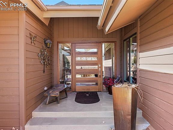 From the gated entry courtyard, to the Custom pivoting Sun Mountain front door to the Vaulted ceilings that frame and capture those amazing views this is a truly special property. Located in the Camels Ridge sub neighborhood of Kissing Camels, with 24 hour staffed security this property provides a welcome retreat. There is an option for Main level living with 2 updated bedrooms on the main level (including the Master/Primary bedroom) a 3rd bedroom or office, 3 baths, living room, dining room, kitchen and laundry. There are walkouts from the Master, Kitchen, Living Room and dining room with covered patio to provide shield and shade. The owners purchased the property and spent almost 6 months freshening the home with improvements such as new flooring, remove popcorn ceilings, new Pella windows, totally redone kitchen with Quartz counters, Wolf cooktop, Dacor fridge , Master bath with spa shower and much more. Soaring ceilings, massive new gas fireplace on 12ft+ stone fireplace and wet bar all add to the welcoming environment. The back yard fencing will contain pets or children and the property is sited to maximize golf course, front range and Pikes Peak Views. You have a newer Decra Roof that is approximately 7 years new. The lower level offers the option of an additional 3 bedrooms, bar, game room, workout area, storage and bath. Hoa provides exterior yard maintenance, garbage pickup and driveway snow removal freeing you up from those chores.