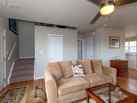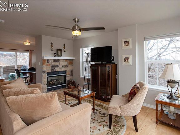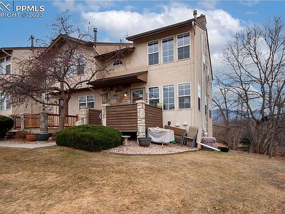 Beautiful and private cul-de-sac end unit with mountain and Peak views, and open space on two sides. Redone Kitchen and Baths, vaulted ceilings, hardwood floors in main living area. Kitchen has granite, SS appliances, tile floor, eating bar, subway tile backsplash. Dining area has walkout to the rear deck and shares a two-sided gas fireplace with the Living room. Main level 3/4 Bath with easy entry shower. Lower level laundry/storage area has walk-out to spacious garage with entry keypad. Energy-efficient vinyl windows with blinds ensure privacy. Well-maintained complex is quiet yet conveniently located, bordering open space and with front range views. The Broadmoorings community has a pool and clubhouse, greenspace areas, and is located right across the street from Quail Lake with access to walking trails and recreation. Strategically situated, just minutes away from shopping, dining, recreation, Vasa Fitness, Ft. Carson, I-25.