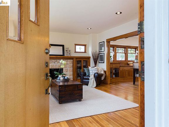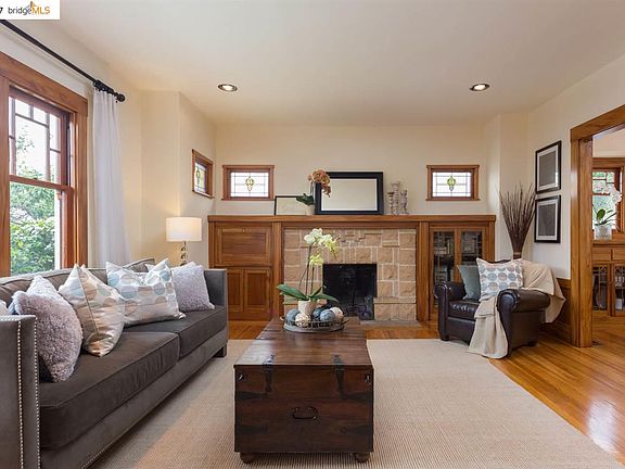 A rare find, located on a unique and historic Alameda street. This house is a showpiece of Craftsman architecture, from its overhanging gables and inviting front porch to its rich interior woodwork, built-ins and carefully-restored gumwood trim. This split-level, 2+ bedroom home features a living room and dining room that flow into each other, with a fireplace, built-in bookshelves and buffet, stained glass windows, and other Arts and Crafts details. The master bedroom includes a spacious, sunny alcove. The bathroom offers both a clawfoot tub and a stall shower. An efficiently organized back garden finds space for a hot tub and BBQ area. Storage galore throughout the house. Come find your home here.